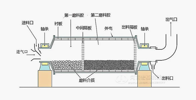 物料由石英砂球磨機(jī)進(jìn)料端空心軸裝入筒體內(nèi),當(dāng)筒體轉(zhuǎn)動(dòng)時(shí)候,研磨體由于慣性和離心力作用,摩擦力的作用,使它附近筒體襯板上被筒體帶走,當(dāng)被帶到一定的高度時(shí)候,由于其本身的重力作用而被拋落,下落的研磨體像拋射體一樣將筒體內(nèi)的物料給擊碎。石英砂物料由進(jìn)料裝置經(jīng)入料中空軸螺旋均勻地進(jìn)入磨機(jī)第一倉(cāng),該倉(cāng)內(nèi)有階梯襯板或波紋襯板,內(nèi)裝不同規(guī)格鋼球,筒體轉(zhuǎn)動(dòng)產(chǎn)生離心力將鋼球帶到一定高度后落下,對(duì)物料產(chǎn)生重?fù)艉脱心プ饔?。物料在第一倉(cāng)達(dá)到粗磨后,經(jīng)單層隔倉(cāng)板進(jìn)入第二倉(cāng),該倉(cāng)內(nèi)鑲有平襯板,內(nèi)有鋼球,將物料進(jìn)一步研磨。